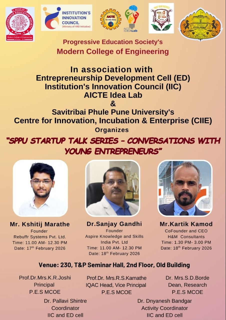 ED Cell & IIC of PES's Modern College of Engineering, in Association with SPPU's CIIE, is organizing a "Startup Talk Series- Conversation with Young Startup Entrepreneurs"
